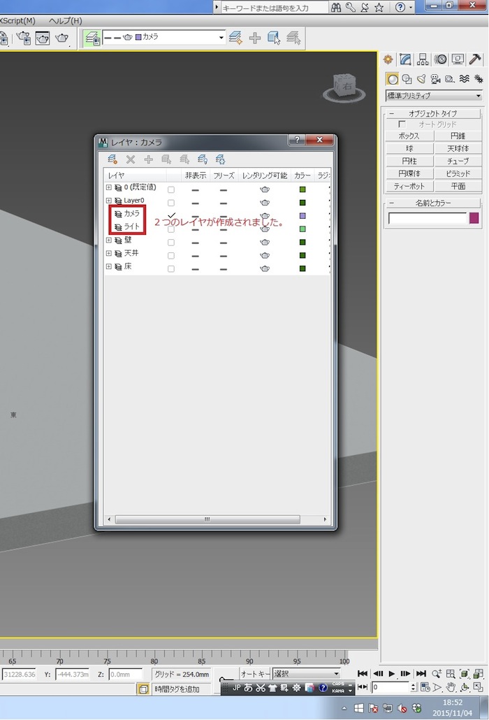 作成するのは、2つの新規レイヤ「カメラ」と「ライト」