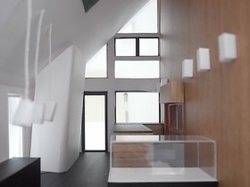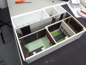 建築の空間構成を検討や大きなカラーバランスを見るには1/50で行います。しかし、インテリアの検討には1/30模型を作ります。家具やドアの枠周りのデザインなど詳細検討…